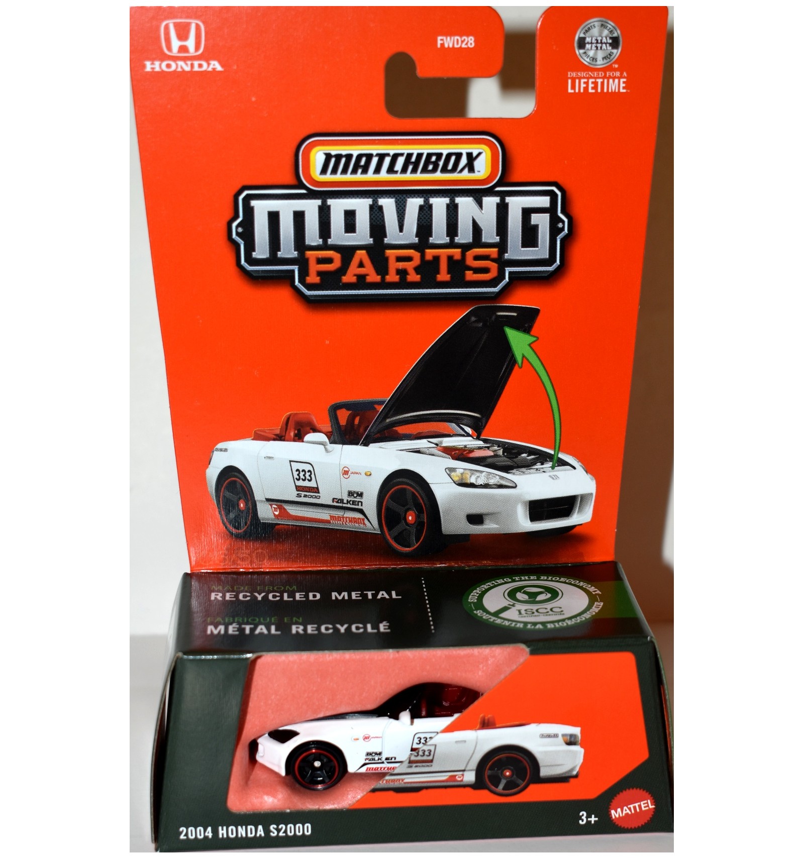This is the iconic 2004 Honda S2000 Convertible from Matchbox, with an opening hood.