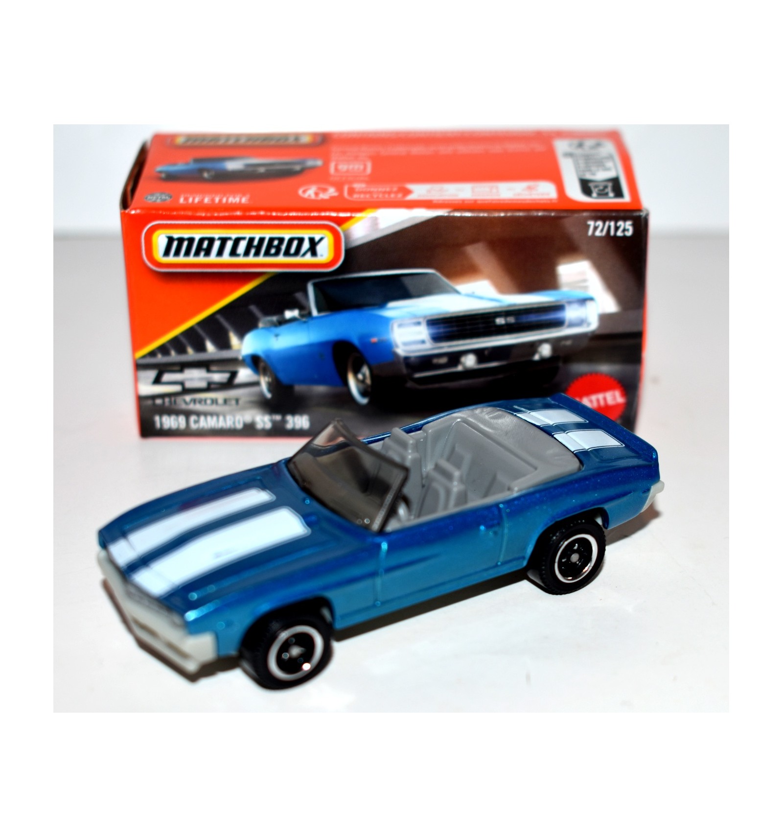 This is a beautiful 1969 Chevy Camaro SS-396 Convertible from Matchbox. This is a gorgeous color of this Camaro, and this is the power grabs version with a matching Matchbox! It is a great cross-collectible, so if you collect Matchbox, Chevrolet, Camaro, Convertibles or Muscle Cars this will be a wonderful addition to your collection. (1:64 Scale)