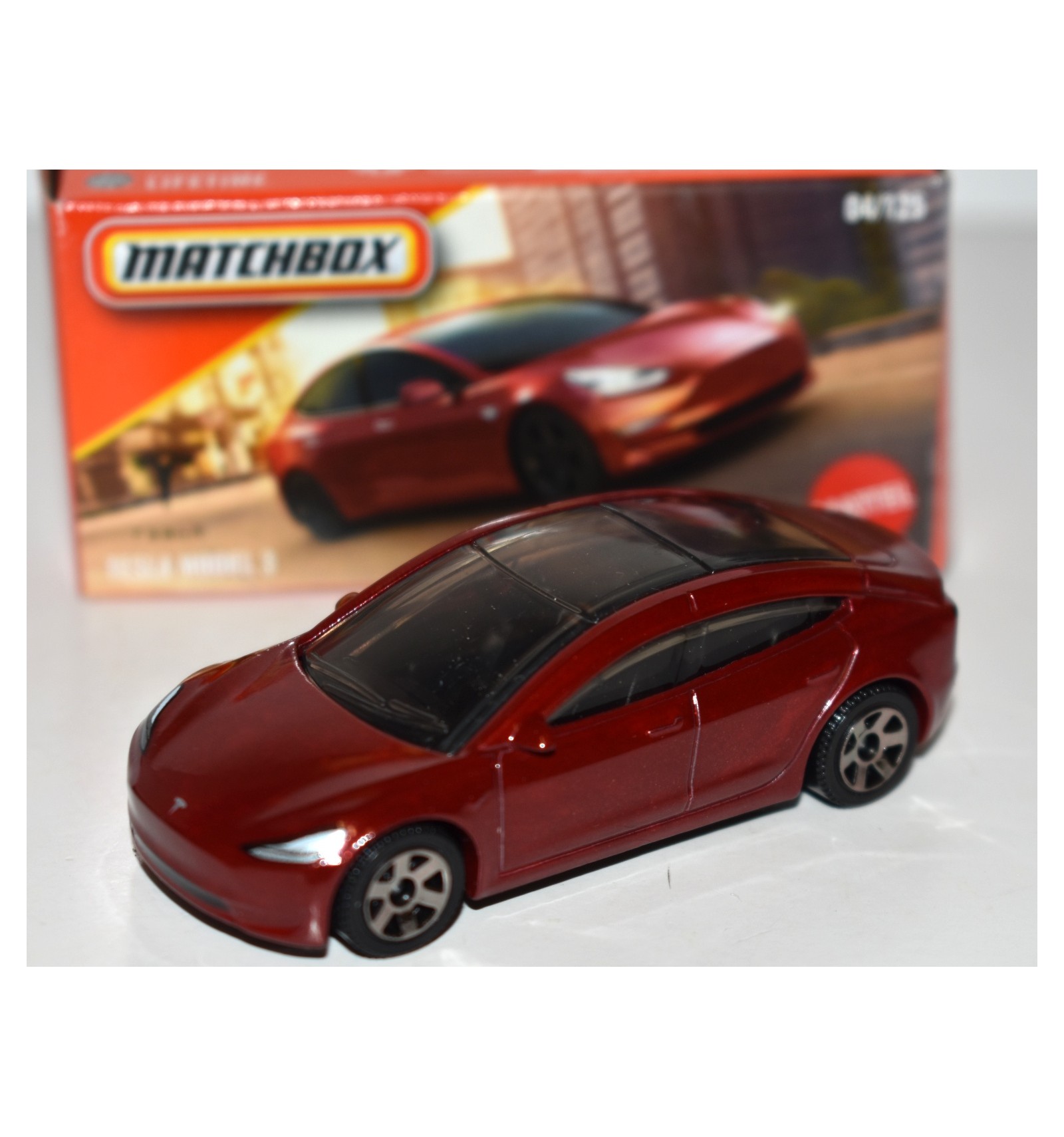 This is the beautiful Power Grabs Tesla Model 3 with a matching box from Matchbox. It is a very nicely detailed casting and color of the Model 3.