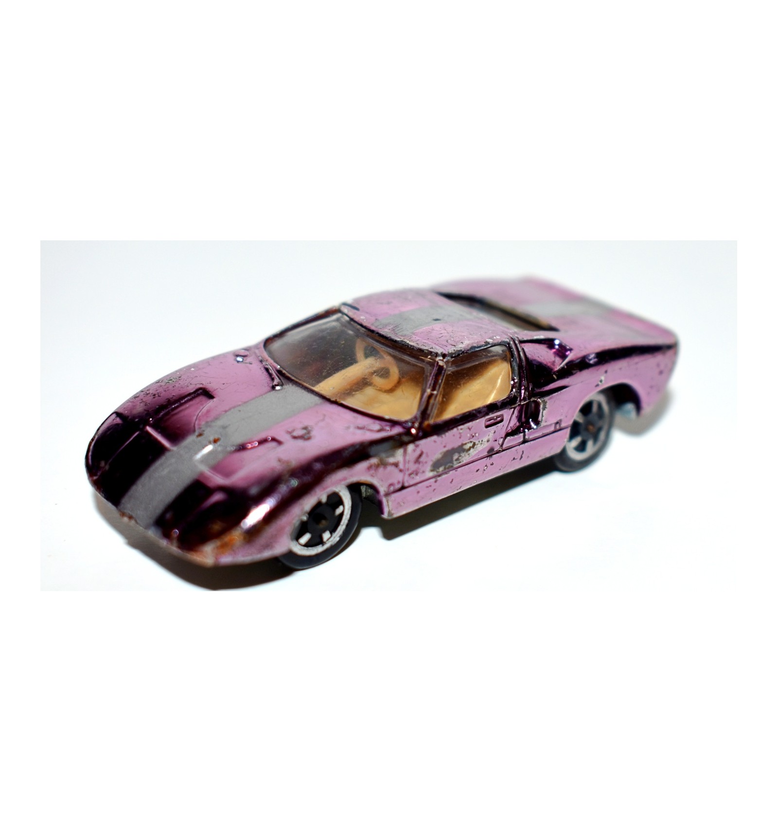 This is the beautiful Ford GT, and it is the very hard to find purple version. It was released 40+ years ago in the 1960’s. This has some minor paint cracking which is typical of these aurora chrome paint jobs, but is a wonderful example of a hard to find piece. If you collect Ford, Ford GT’s or Aurora this is a great find for your collection (1:64 Scale)