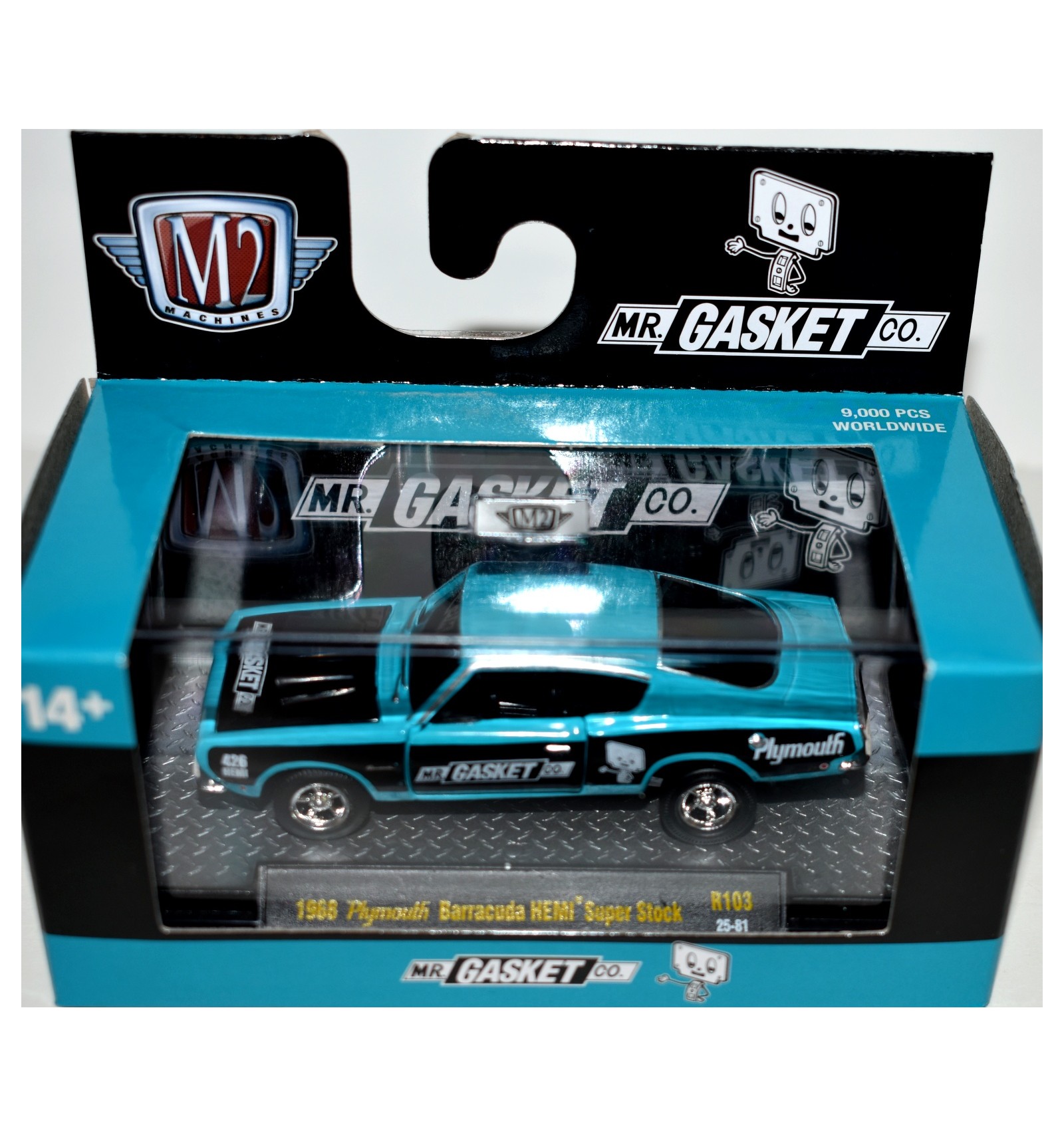 This is theMr Gasket 1968 Plymouth Barracuda HEMI NHRA Super Stock. The colors are outstanding. It’s from the M2 Authentics Series, R103. If you collect MOPAR, NHRA, Barracuda's, Muscle Cars or M2 Machines this is a great addition for your collection. (1:64 Scale)