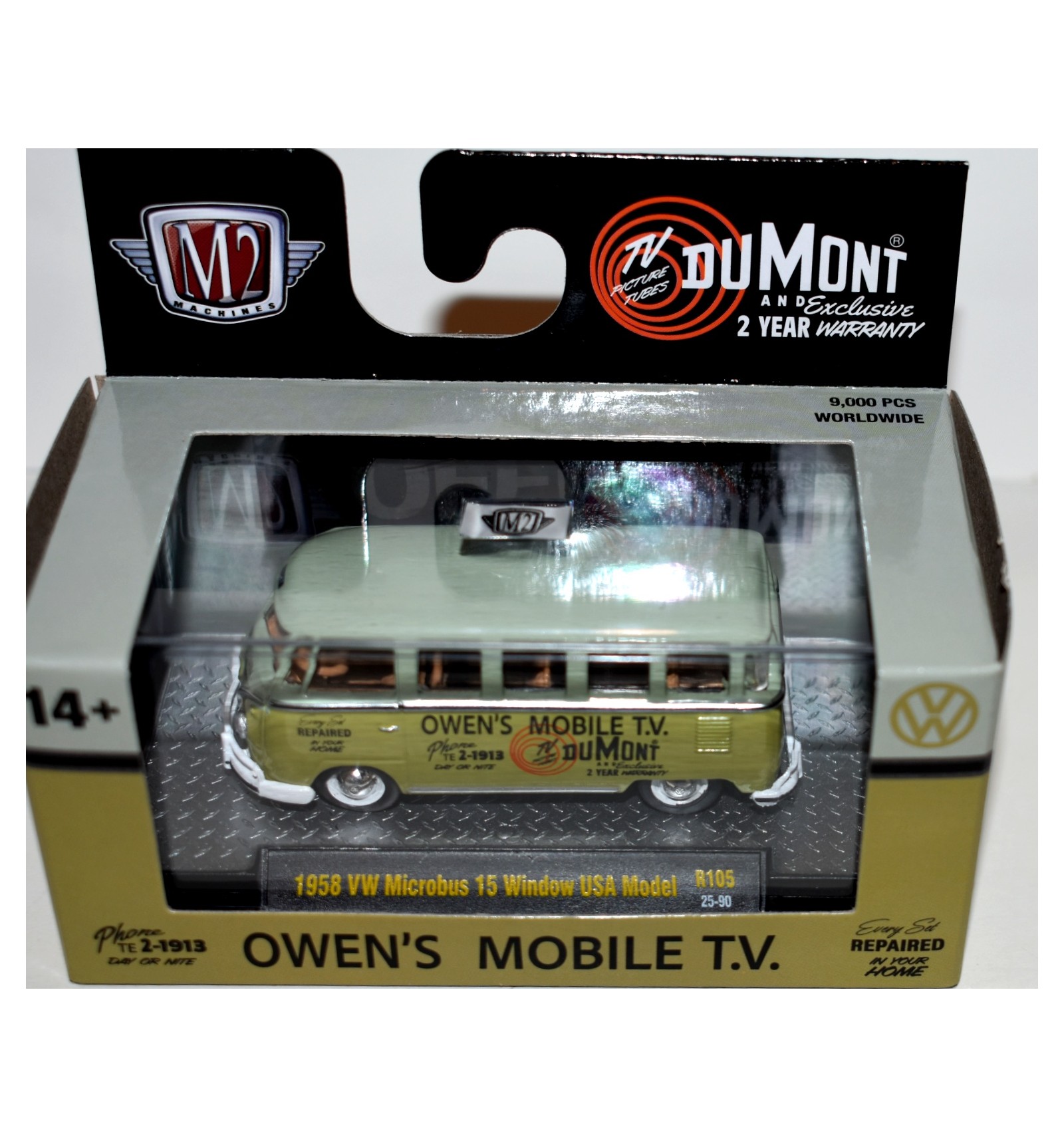 This is the beautiful 1958 VW Microbus 15 Window USA Model Owens TV Repair. It's from the Autothentics series R105 . If you collect Volkswagen, Vans or M2 Machines this is a great addition for your collection. (1:64 Scale)