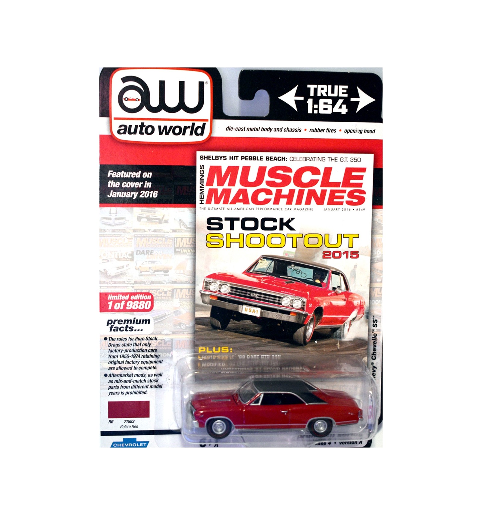 This is the 1967 Chevelle SS from Auto World. It's one of 9880 that were produced in this stunning GM Factory Bolero Red paint, witha black vinyl top. It is a beautifully detailed casting of the 1967 Chevy Chevelle SS , which is arguably the most beautiful of all the Chevelle body styles. If you collect Chevrolet, Chevelles, MuscleCars, or Auto World this is a wonderful addition to your collection. (1:64 Scale)