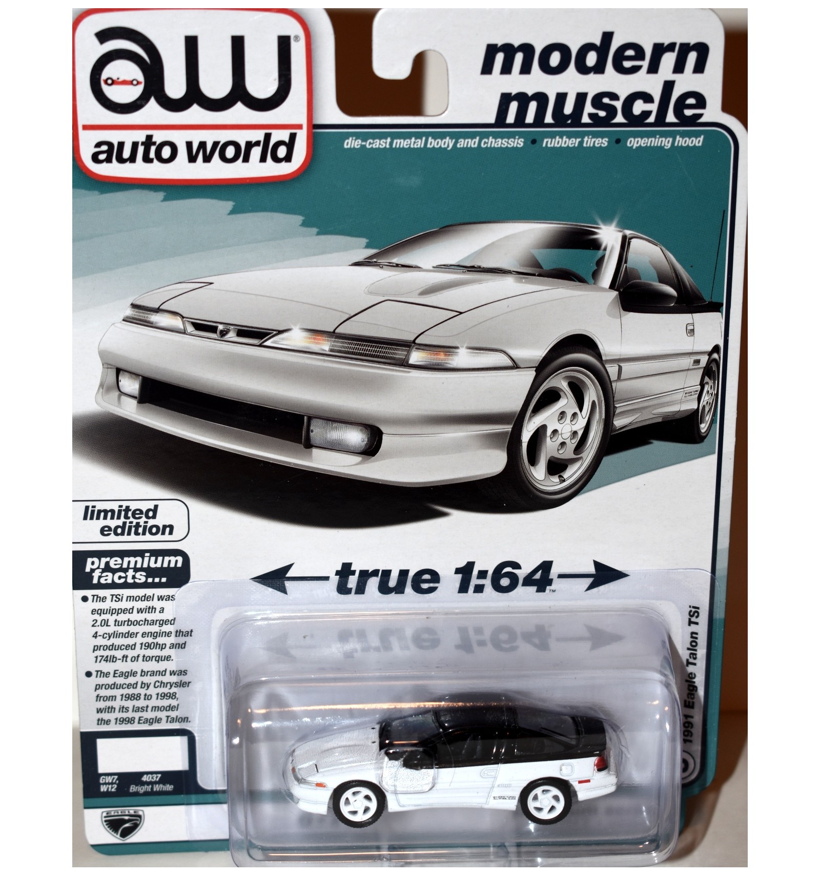 This is the beautiful 1991 Eagle Talon TSi. It is a beautifully detailed casting, and it's a limited edition in White. The Eagle was a collaboration between Chrysler and Mitsubishi.
