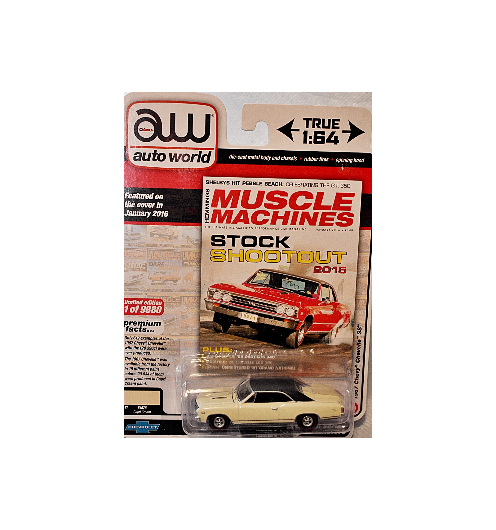 This is the 1967 Chevelle SS from Auto World. It's one of 9880 that were produced in this stunning GM Factory Capri Cream paint, with a black vinyl top. It is a beautifully detailed casting of the 1967 Chevy Chevelle SS , which is arguably the most beautiful of all the Chevelle body styles. If you collect Chevrolet, Chevelles, MuscleCars, or Auto World this is a wonderful addition to your collection. (1:64 Scale)