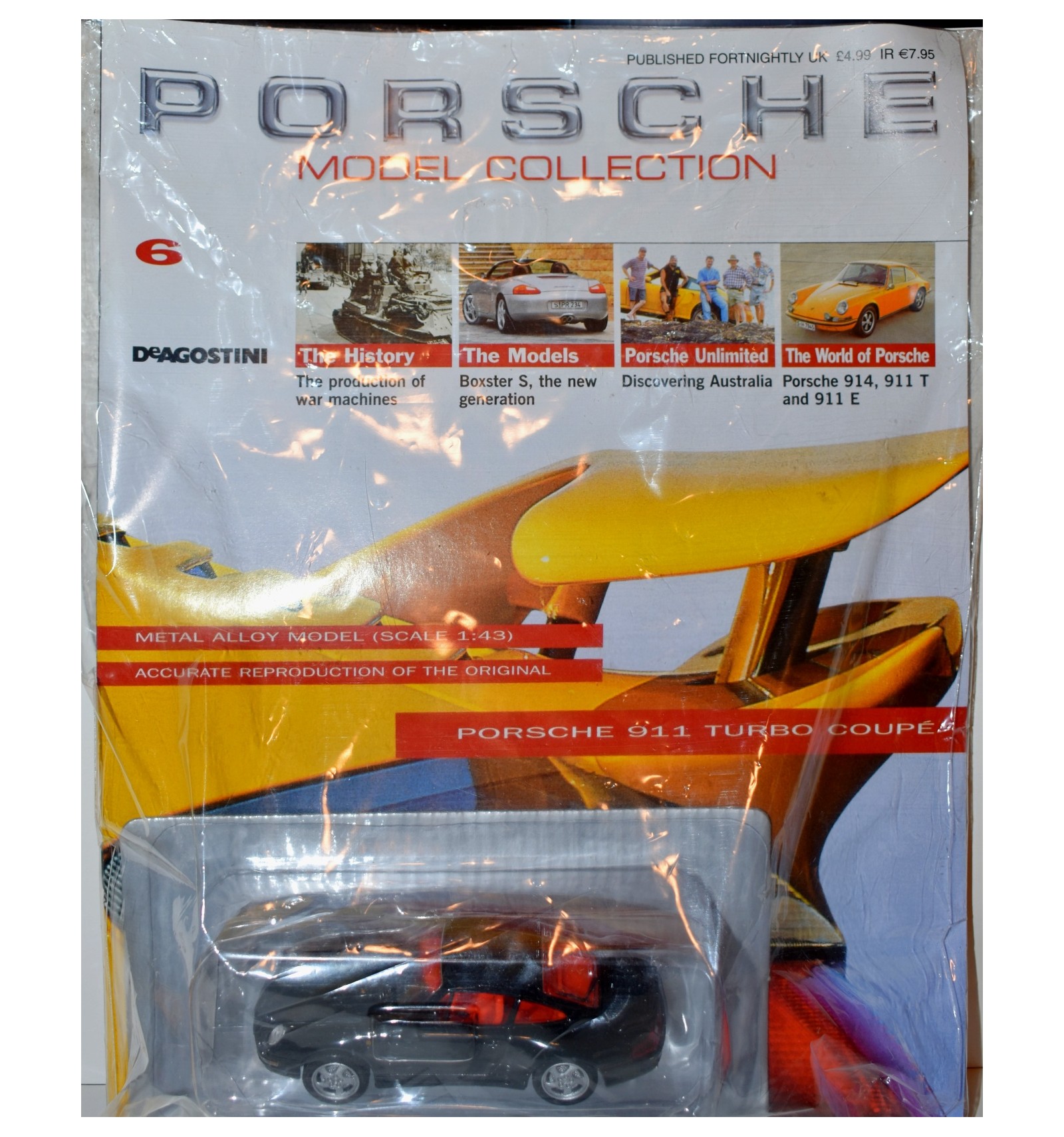 It is part of a small collection of Porsches that were created for promotional use as the DeAgostini Porsche Model Collection. Each is featured in the magazine, and each car comes with a display stand. Not the cellophane is very flimsy, and in some cases taped were the display stand went through it. Car and Magazine are in wonderful condition.