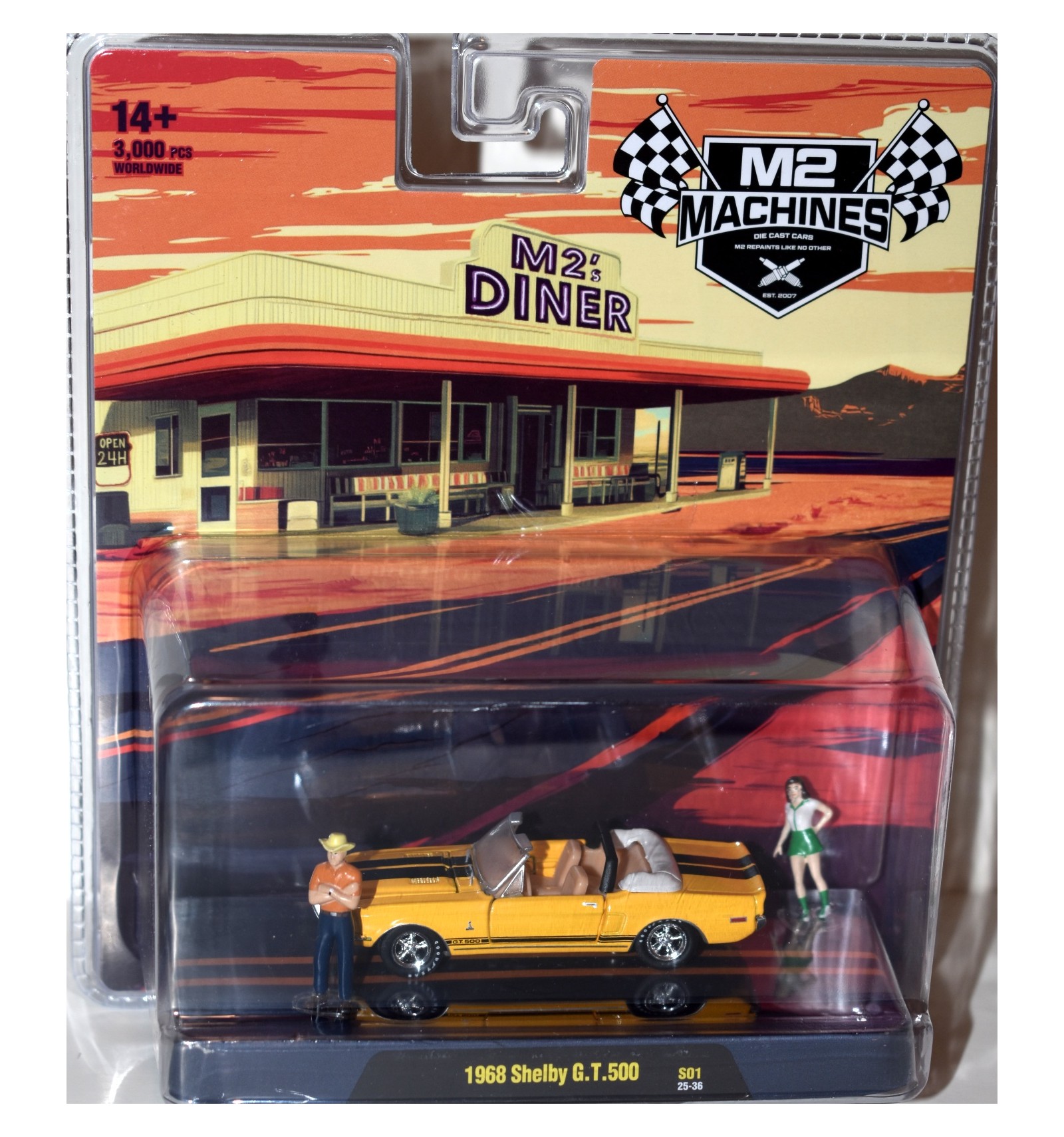 Here is the M2 Diorama Series M2 Diner 1968 Shelby GT 500 Mustang Diorama Set. It comes with two figures! If you collect Ford, Mustang/Shelby, Diners or Dioramas this is a wonderful set for your collection (1:64 Scale)