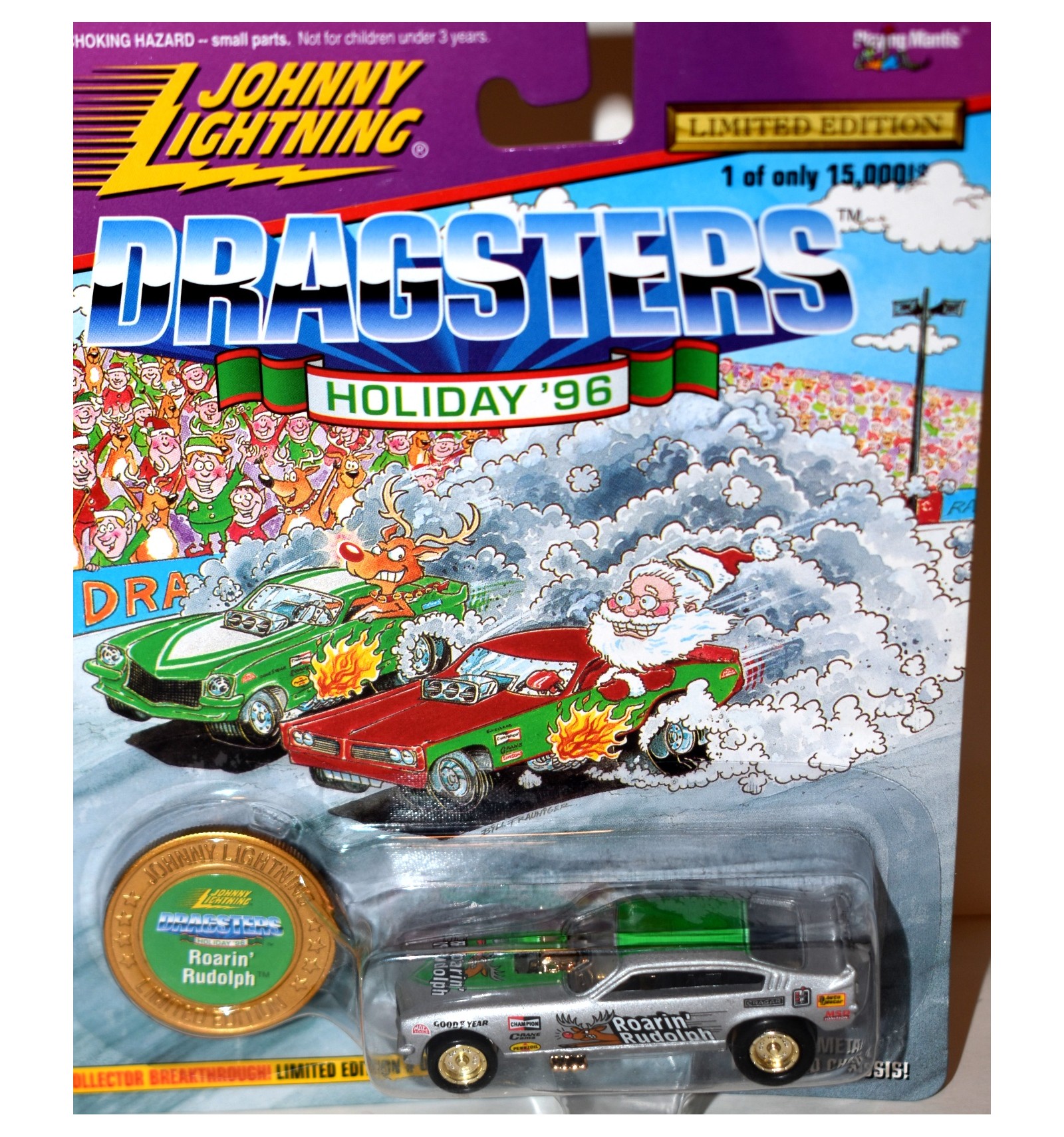 This is the beautiful Roaring' Rudolpf 1971 Chevrolet Vega NHRA Funny Car. It is from the Johnny Lightning Dragsters USA Holiday Set. This was released 25+ years ago in 1996 and it's been almost that long since we've had this silver color version in stock.