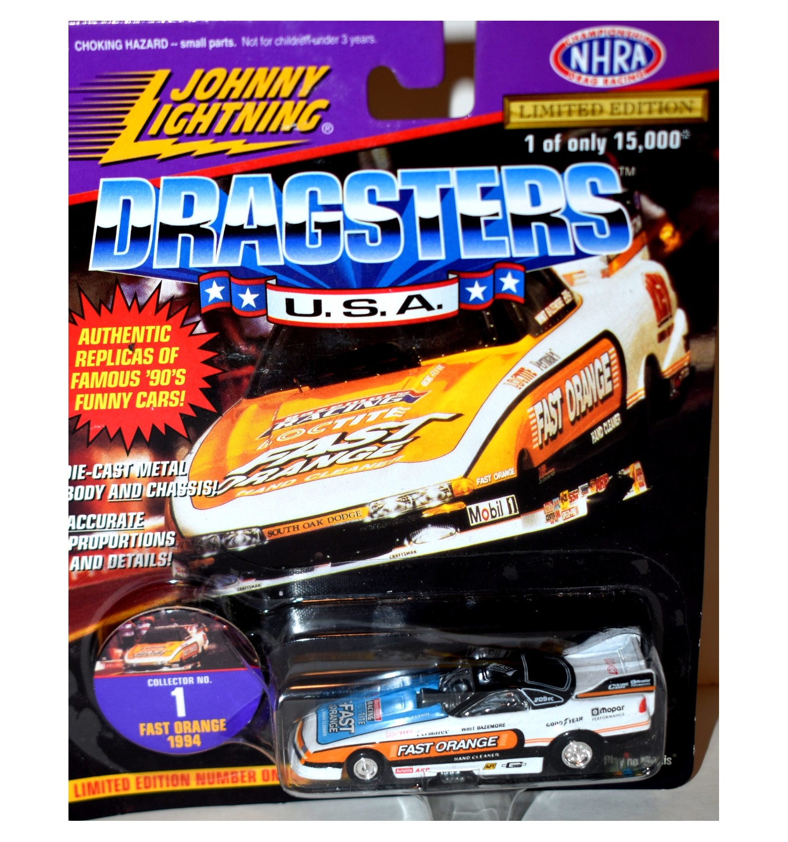 This is a beautiful 1994 Dodge Daytona Fast Orange NHRA Funny Car from the Johnny Lightning Dragsters 97, R-1. It was released 25+ years ago, back in early 1997!