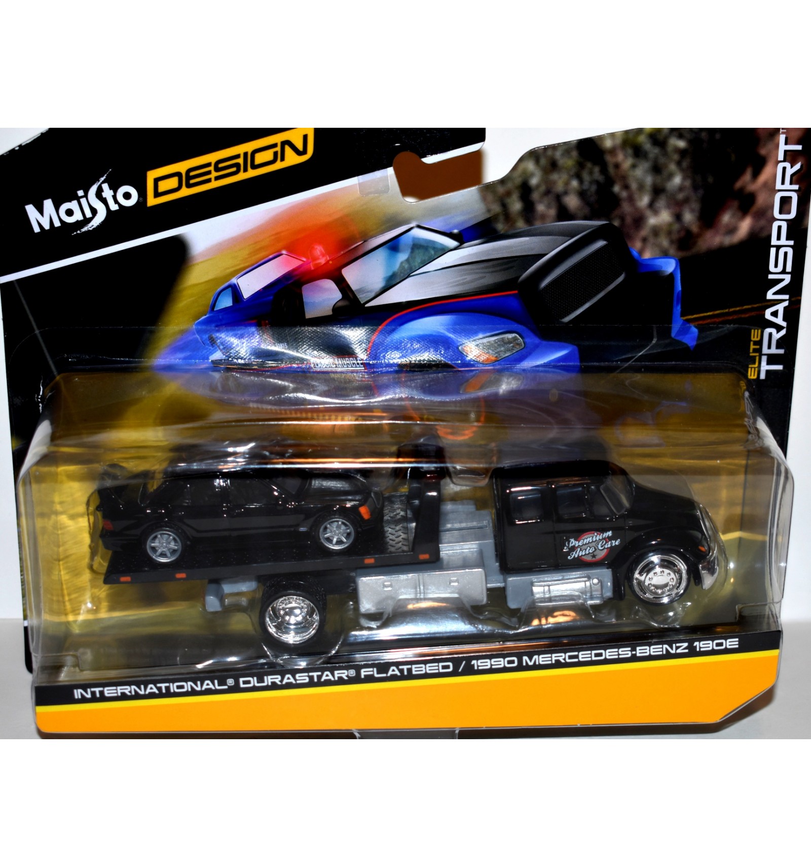 Maisto Elite Transport Set - 1990 Mercedes 190 E & International Durastar Flatbed Transporter