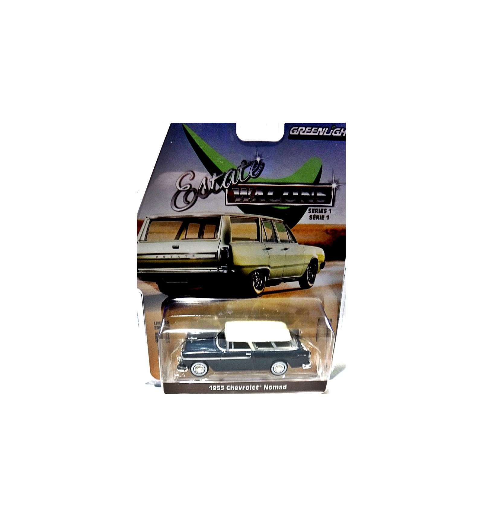 This is the 1955 Chevrolet Nomad, arguably the coolest of all 50's and 60's wagons. This car is stunning in its deep blue color with the white roof. If you collect Station Wagons, Nomads Chevy, Tri-Chevys or Greenlight this is a beautiful addition for your collection (1:64 Scale)