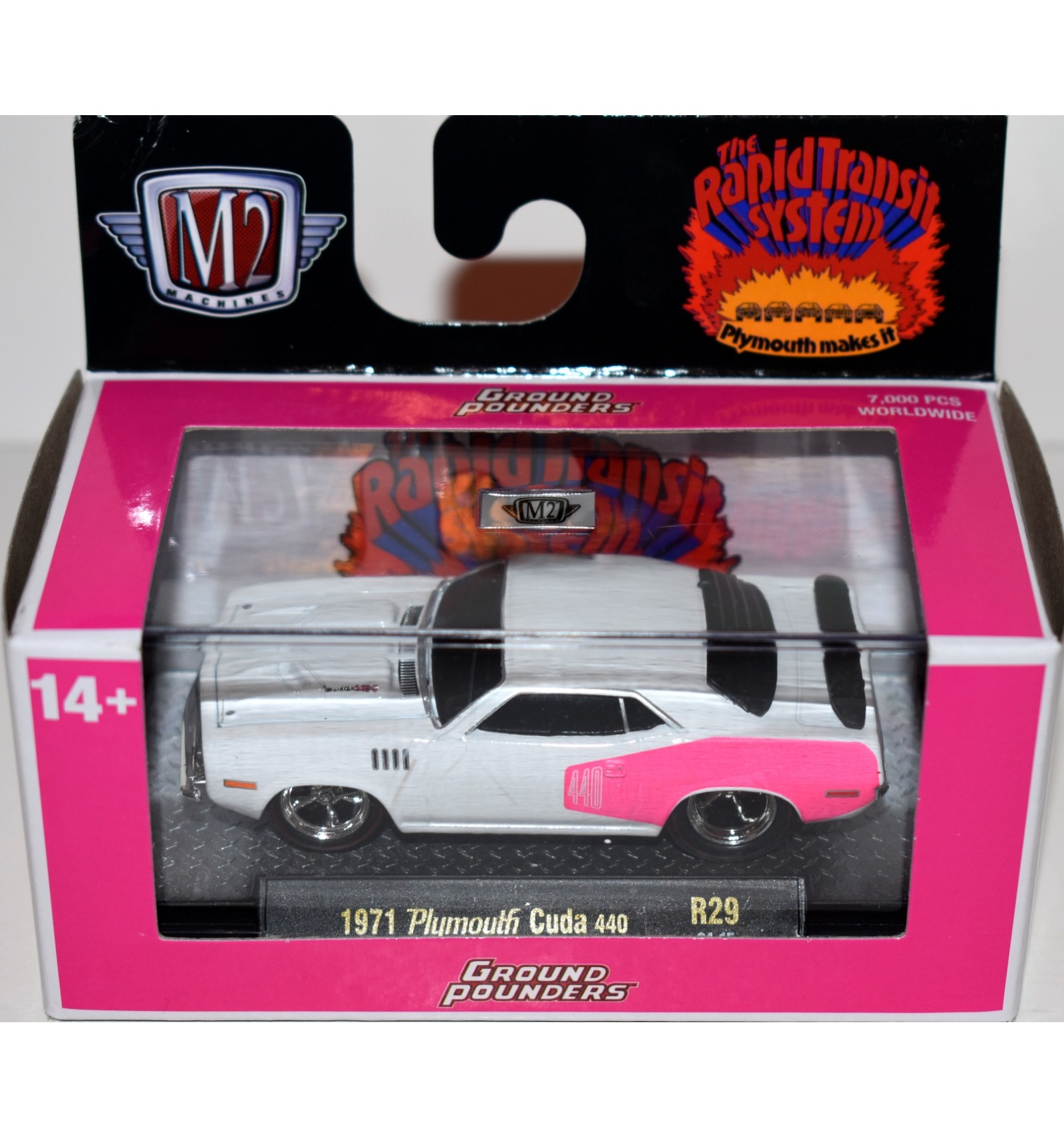 This is the 1971 Plymouth Cuda 440 from the M2 Machines Ground Pounders series, R-29. This is a very popular cross collectible, so if you collect MOPAR, Cudas, Muscle Cars or M2 Machines this will be a very colorful addition to your collection. (1:64 Scale)