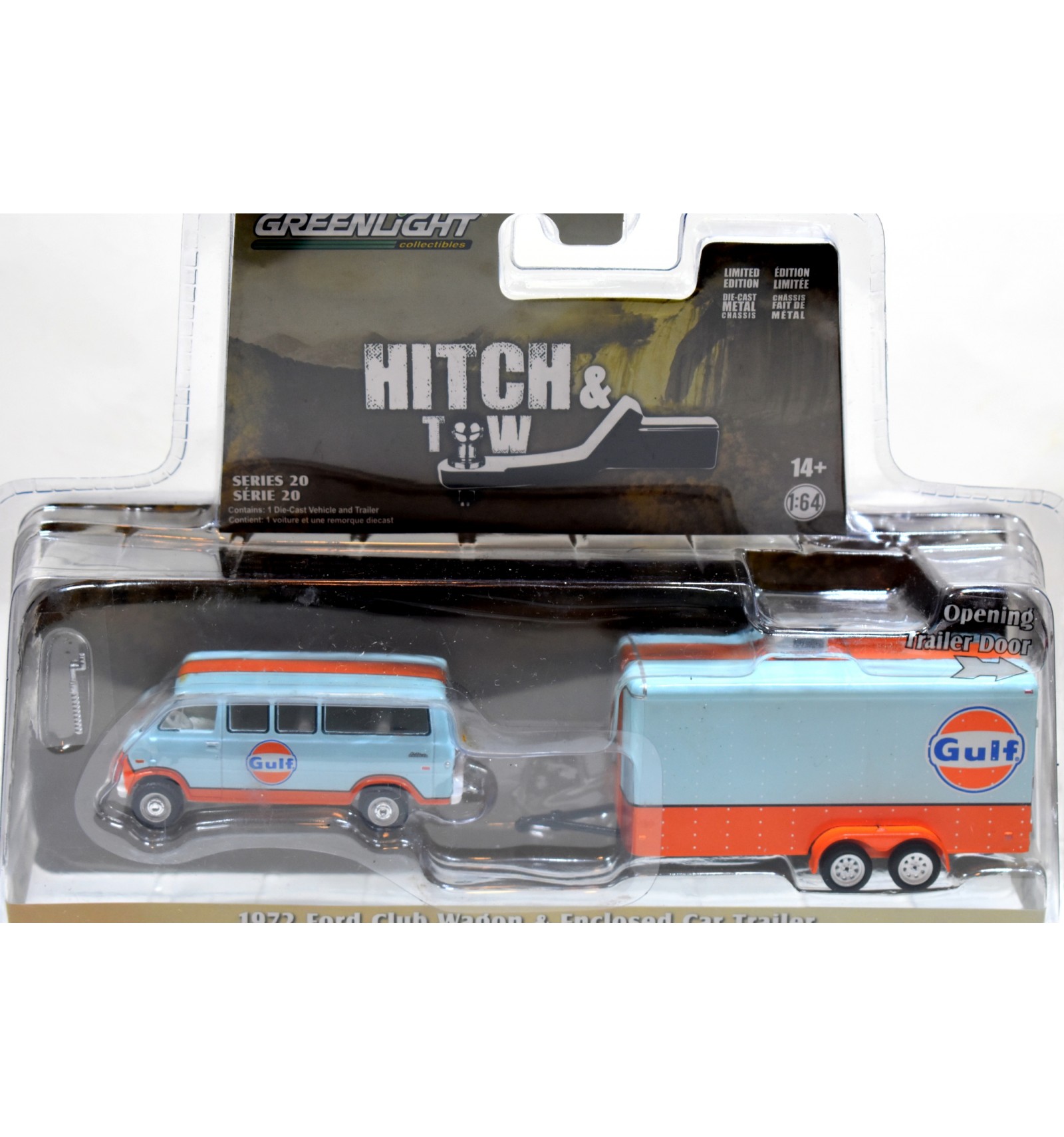 Greenlight Hitch and Tow - Gulf Racing 1972 Ford Club Wagon Van and Race Trailer Set