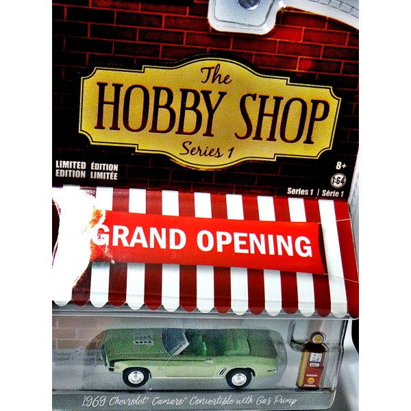 Hobby Shop is a new series from Greenlight that features vehicles and people. This is the 1969 Chevrolet Camaro Convertible. It is comes with a vintage gas pump!
