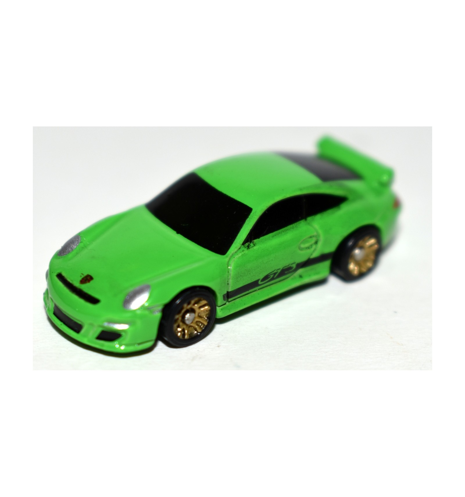 This is the Jada Hollywood Rides Fast & Furious Porsche 911 GT3 (997). These cars are approximately 1:100 scale, or slightly smaller than HO Scale, but larger than N Scale. The colors are amazing.