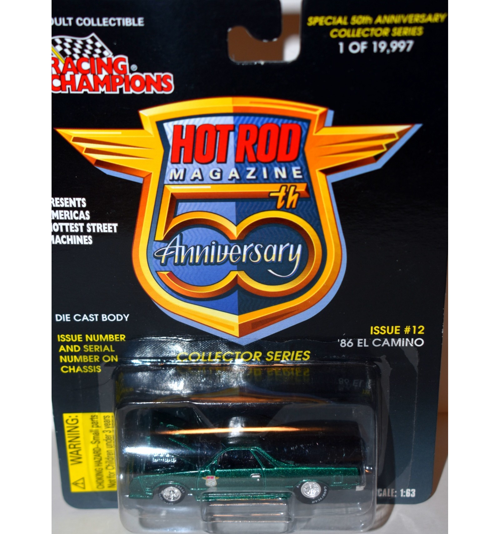 This is the stunning 86 Chevrolet El Camino from the Hot Rod Magazine Series. Released over 20 years ago, it’s been at least 15 years since we’ve had this in stock, and we are pleased to be able to make it available again. If you collect Racing Champions, Chevrolet, El Caminos or Muscle Cars this is a very nice piece for your collection. (1:64 Scale)