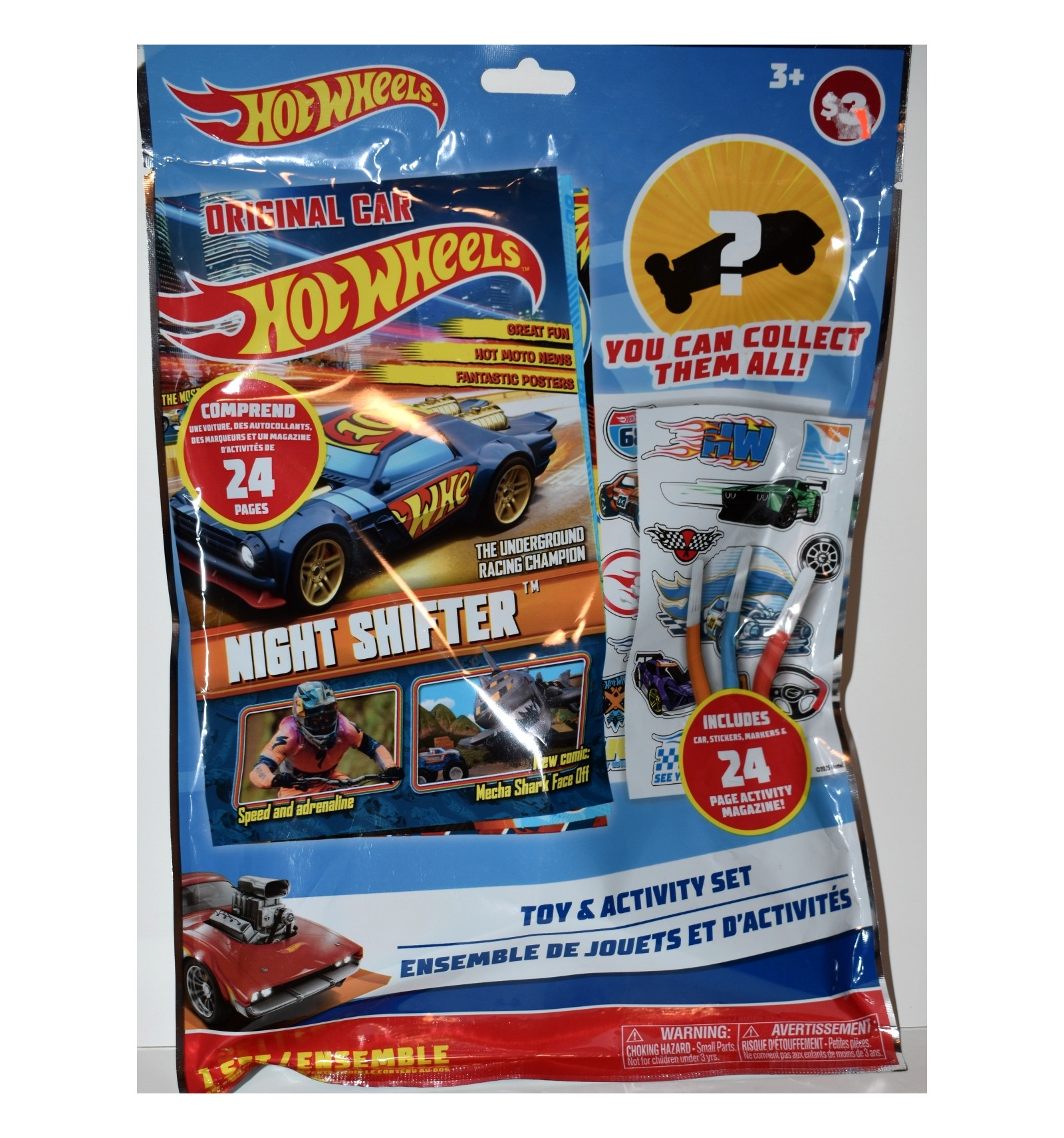 This is a great find. It's the Hot Wheels Toy & Activity Set that comes with a Night Shifter car, stickers and markers to customize to your own one of a kind. If you collect HW designed customs, or HW this is an excellent piece for your collection (1:64 Scale)