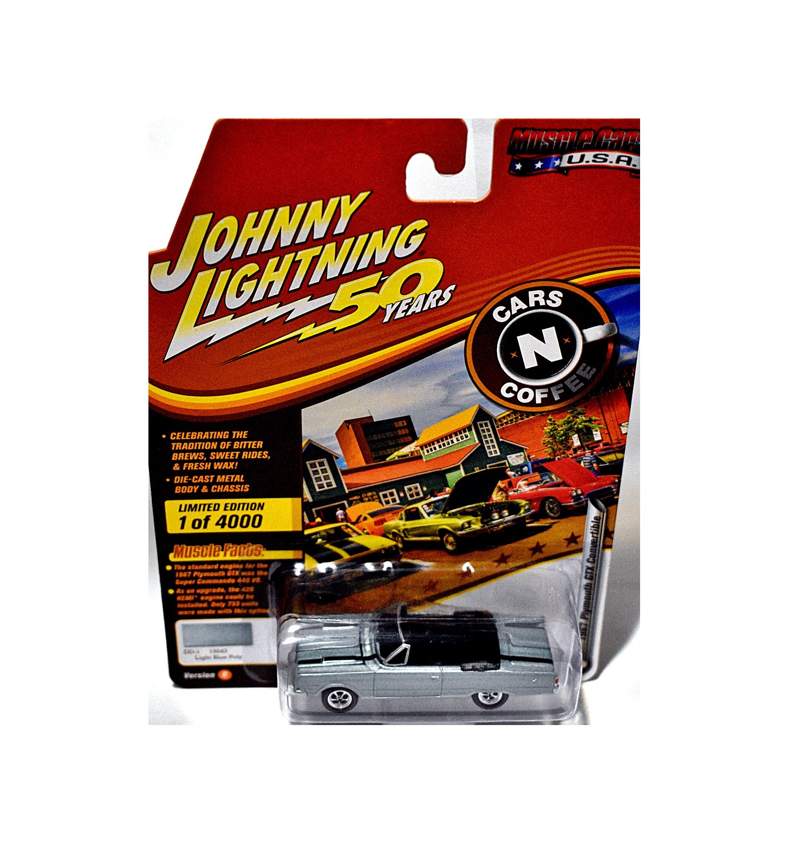 This is the beautiful 1967 Plymouth GTX Convertible from the JL Mustang Muscle Cars USA Series. This car is one of only 2500 released in MOPAR Turbine Bronze Poly, and is one of only 4000 released in this MOPAR Light Blue Poly factory color. Its on a great Cars N Coffee blistercard