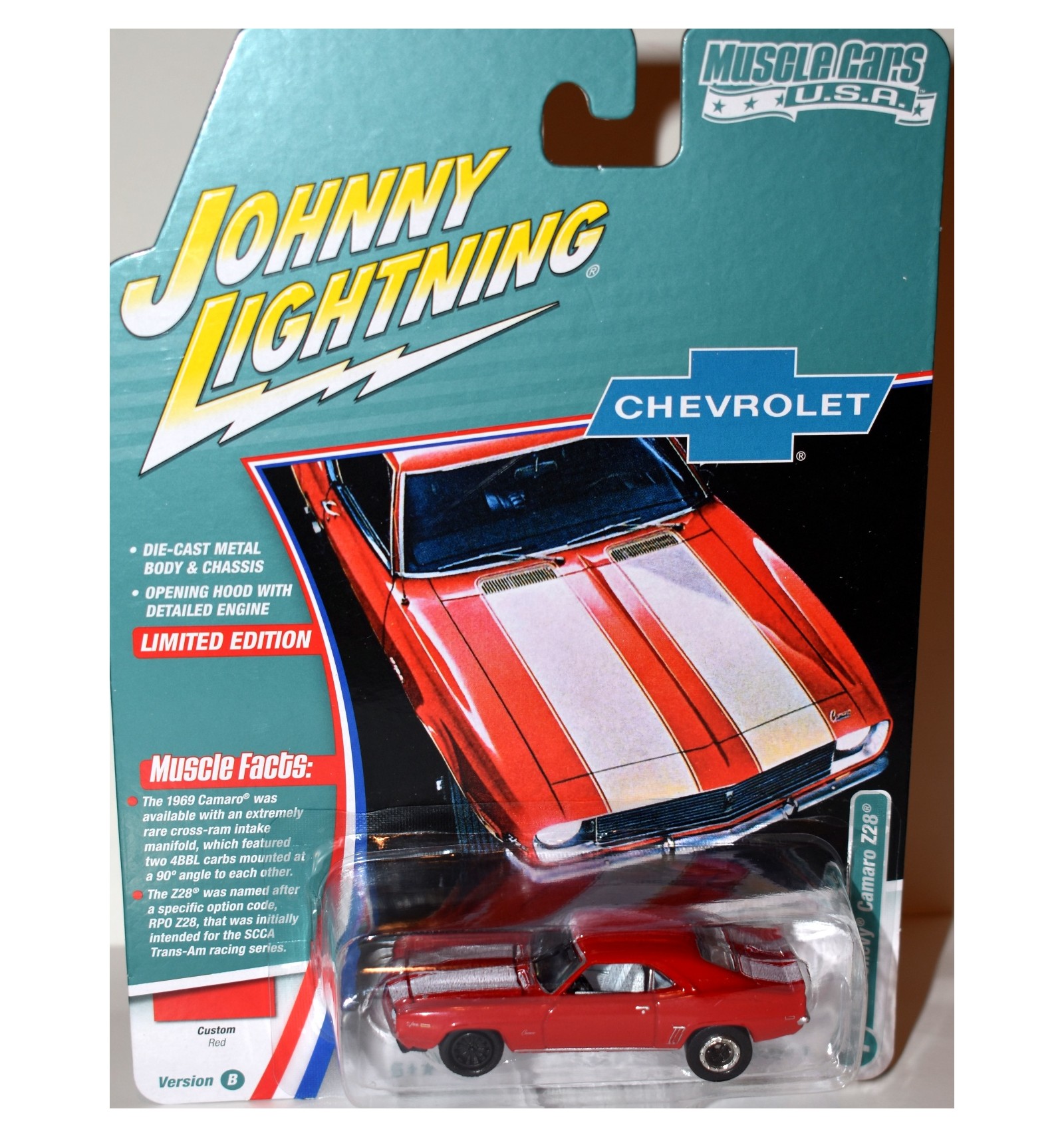 This is the beautiful 1969 Chevy Camaro Z28 from the JL Mustang Muscle Cars USA Series. This is 1 of a limited number produced in the Custom Red paint color.