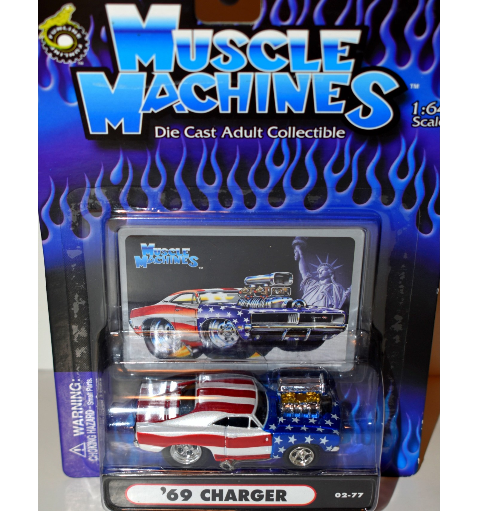 This is a beautiful Stars & Stripes 1969 Dodge Charger that is from the Muscle Machine. It is a great cross-collectible, so if you collect Muscle Machines, Muscle Cars, MOPAR or Chargers this will be a wonderful addition to your collection. (1:64 Scale)