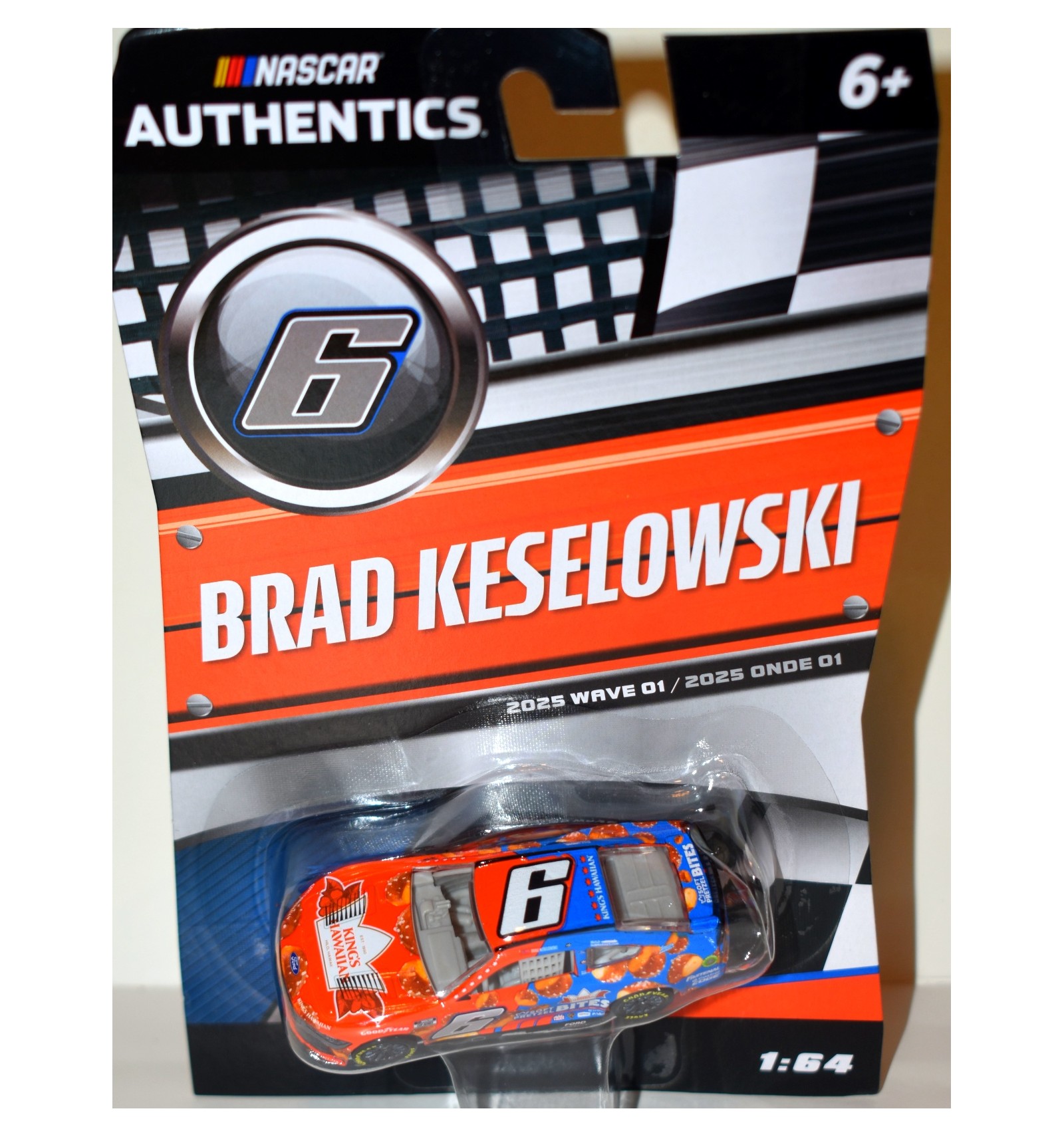NASCAR Authentics has released a beautiful, highly detailed line of NASCAR Stock Cars. This is the Brad Keselowski Kings Hawaiian Ford Mustang Ford Mustang. It is from the 2025 Wave 01 series. If you collect NASCAR, Ford, Kings Hawaiian, Mustang or Keselowski this is a “must have” for your collection. (1:64 Scale)