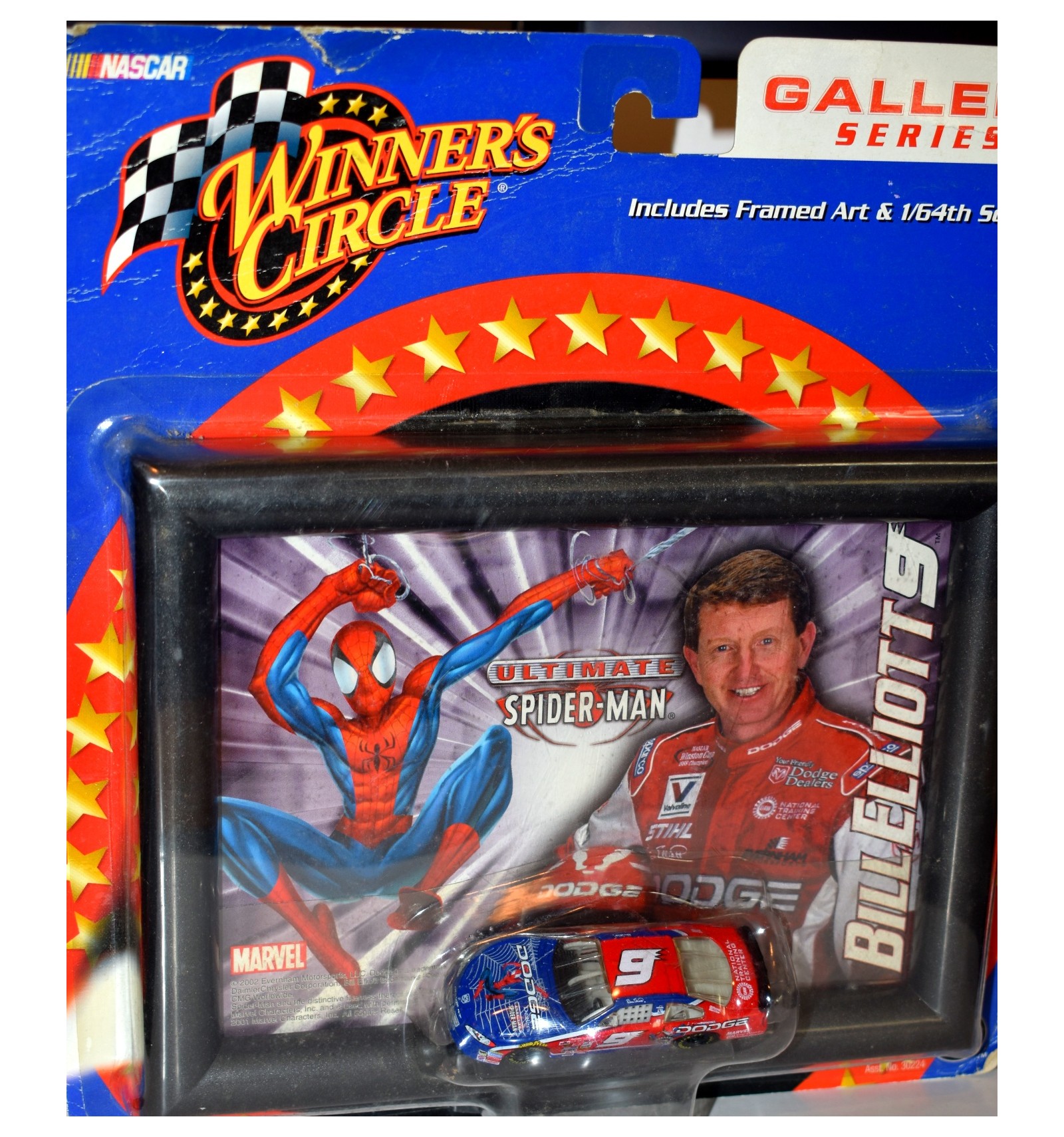This is the Spiderman Bill Elliott Dodge Intrepid R/T on a picture frame from the Winners Circle Gallery Series. This was a one year only series, and it was released 20+ years ago. If you collect NASCAR, MOPAR, Winners Circle, Marvel, Spiderman or Bill Elliott this is a “must have” for your collection. (1:64 Scale)