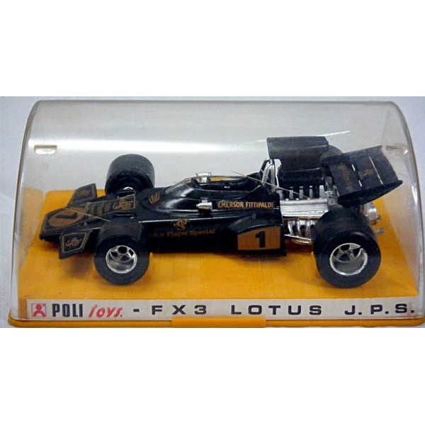 This is a great find. This is a beautiful Emerson Fittapaldi Lotus JPS (John Player Special) F1 Race Car from Italian diecast maker Polistil/Poli Toys. Released 20+ years ago, as you can see from the photos this car is Mint, the display boxes on these are fragile, and tend to scratch and crack easily, this one is in pretty good condition with minimal scratches.