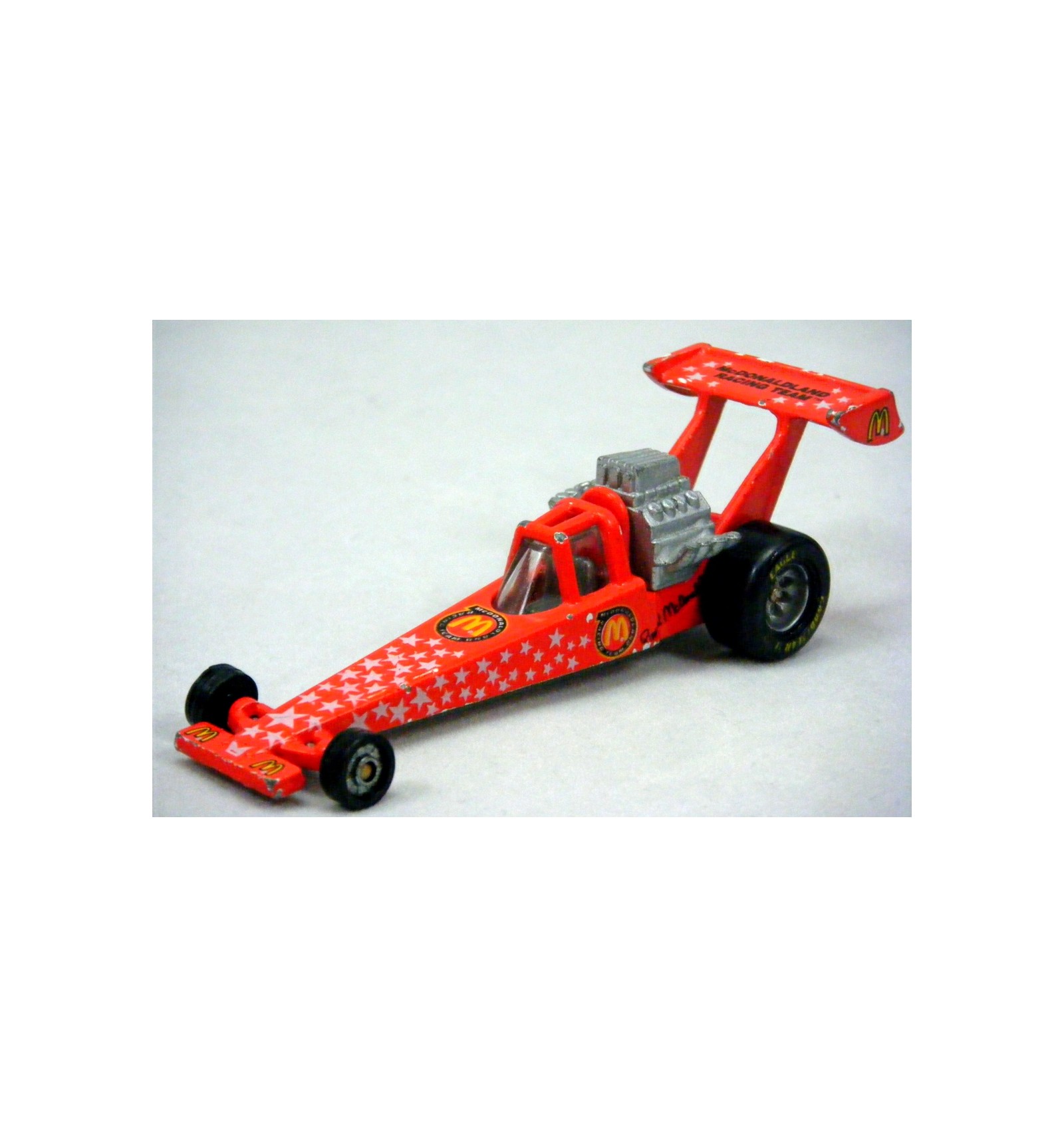 Released 35+ years ago in 1989, this is the McDonalds Racing Team NHRA Top Fuel Dragster from Racing Champions. It has some patina, but it's a great find considering it's age. If you collect McD's, NHRA or Racing Champions this is a colorful piece for your collection (1:64 Scale)