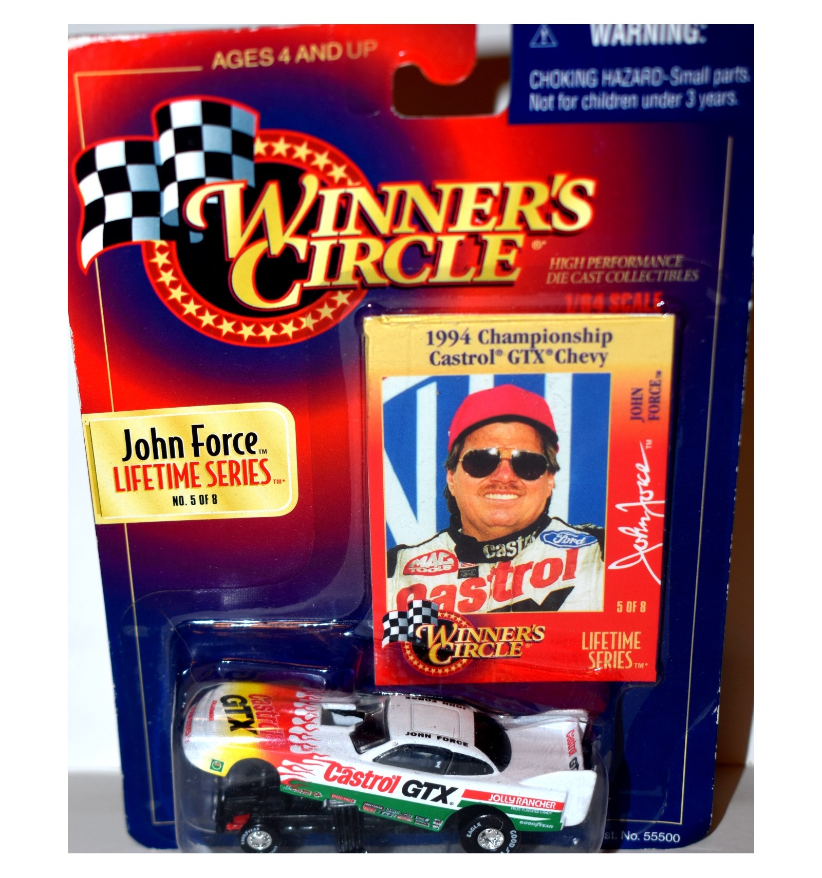 This is a great piece, that was released 25+ years ago back in 1998. It is the John Force Castrol GTX 1994 Chevrolet Funny Car from Winners Circle, which was part of Hasbro at that time. If you collect Force, Hasbro, Winners Circle, Chevrolet or the NHRA this is a very colorful car for your collection (1:64 Scale)
