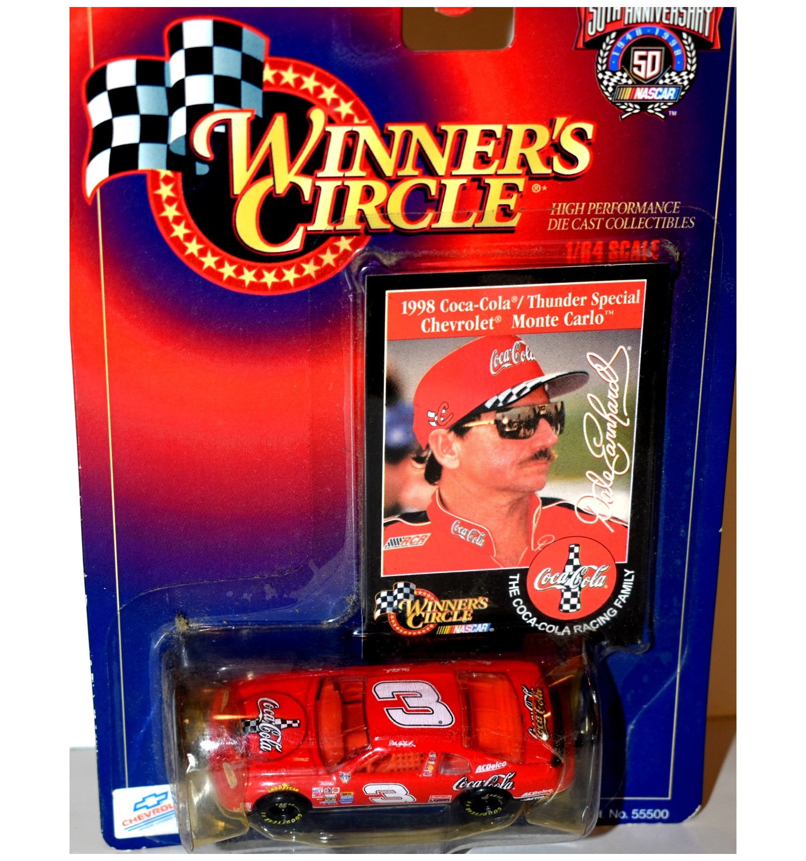 This is the Winners Circle Dale Earnhardt 1998 Coca-Cola Chevy Monte Carlo Stock Car. It was released 25+ years ago, and it is beautiful in its Silver & Red colors. It's a wonderful addition to any Monte Carlo, Chevrolet, Earnhardt, Coke or NASCAR collection. (1:64 Scale)